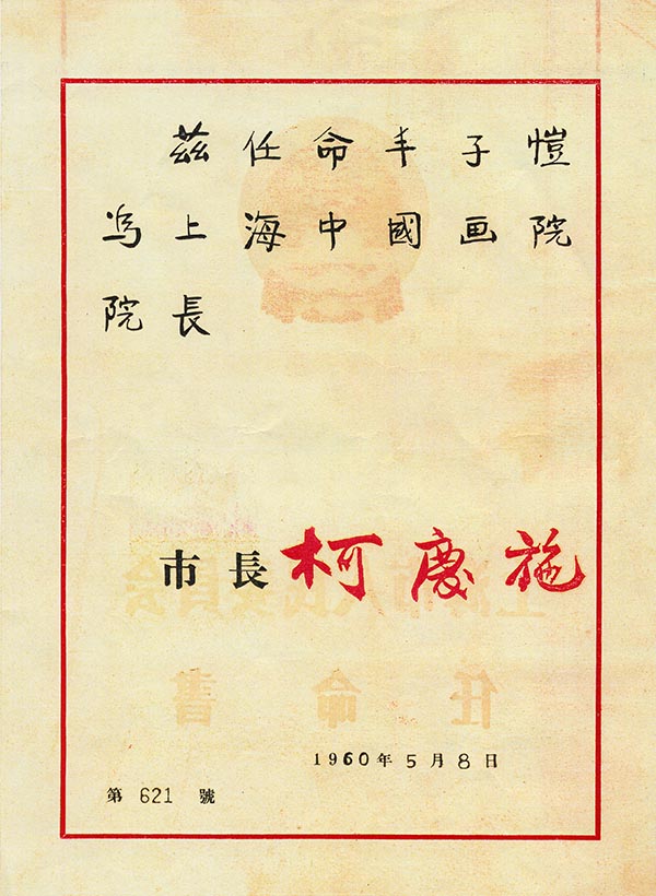 1960年,丰子恺被任命为上海中国画院首任院长,以高尚的艺品人格和巨大影响力对画院的创建发挥了重要的影响。在上世纪五六十年代海派名家云涌的上海画坛,丰子恺像一面旗帜,把众多中国画名家团结到画院周围,并带领画院画师们贯彻“艺术为工农兵服务、为无产阶级服务、为劳动人民服务”的文艺方针,投入到火热的文化建设中。