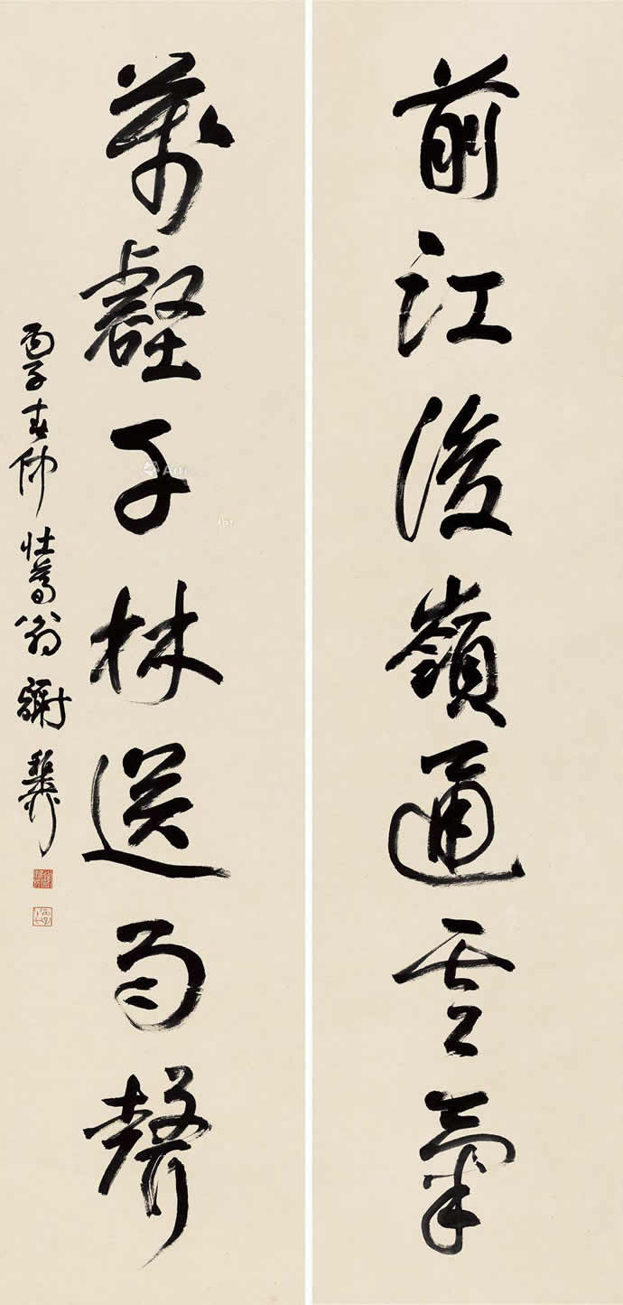 谢稚柳 1996年作 行书七言联 屏条 纸本