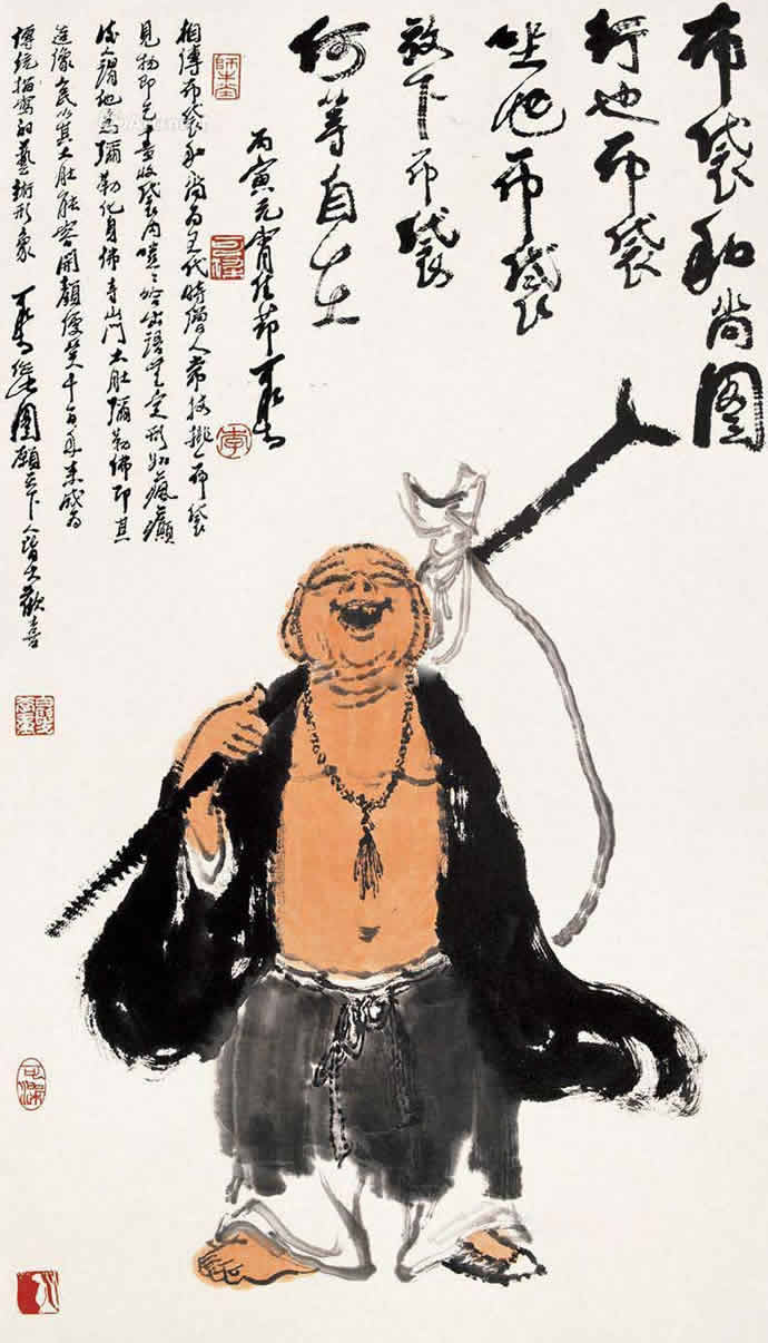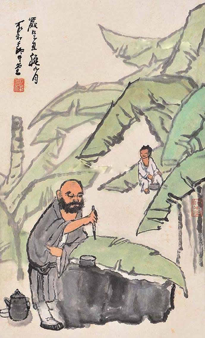 李可染的人物画在表现手法上早期采用简笔、意笔的方式,用笔潇洒放逸,中期笔墨趋于沉着、厚重,到晚期则笔墨老辣、无羁;题材上从文人情趣转向于描绘现实人生继而到抒发自己的人生理想、艺术追求。从李可染早期的《钟馗》,1949 年的《街头卖唱》、1960 年的《赏荷图》到80 年代的《布袋和尚》、《苦吟图》等可窥见其整个艺术人生中的人物画创作部分。