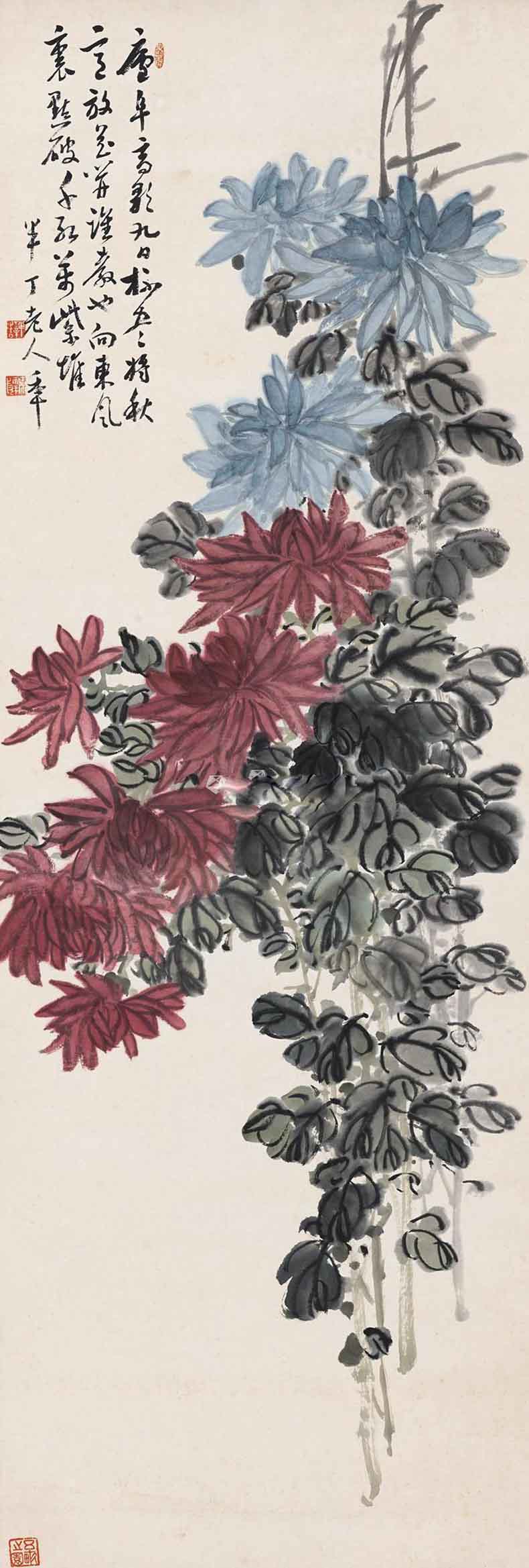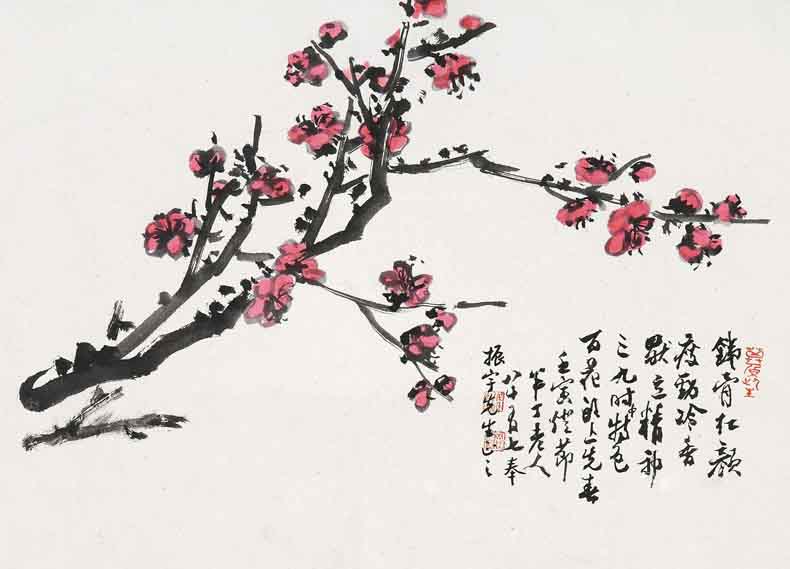 他的作品融明、清各家花卉技法之长,以洗练、概括的笔墨和古朴沉着的色彩来表现花卉鸟兽。他用笔苍劲,力量感强烈,构图稳中出险,善于将诗书画印有机地统一在画幅之中。