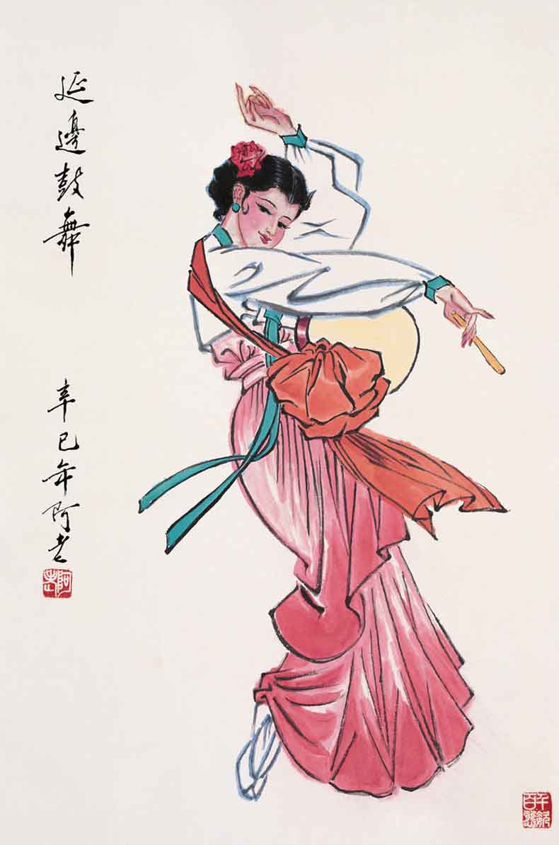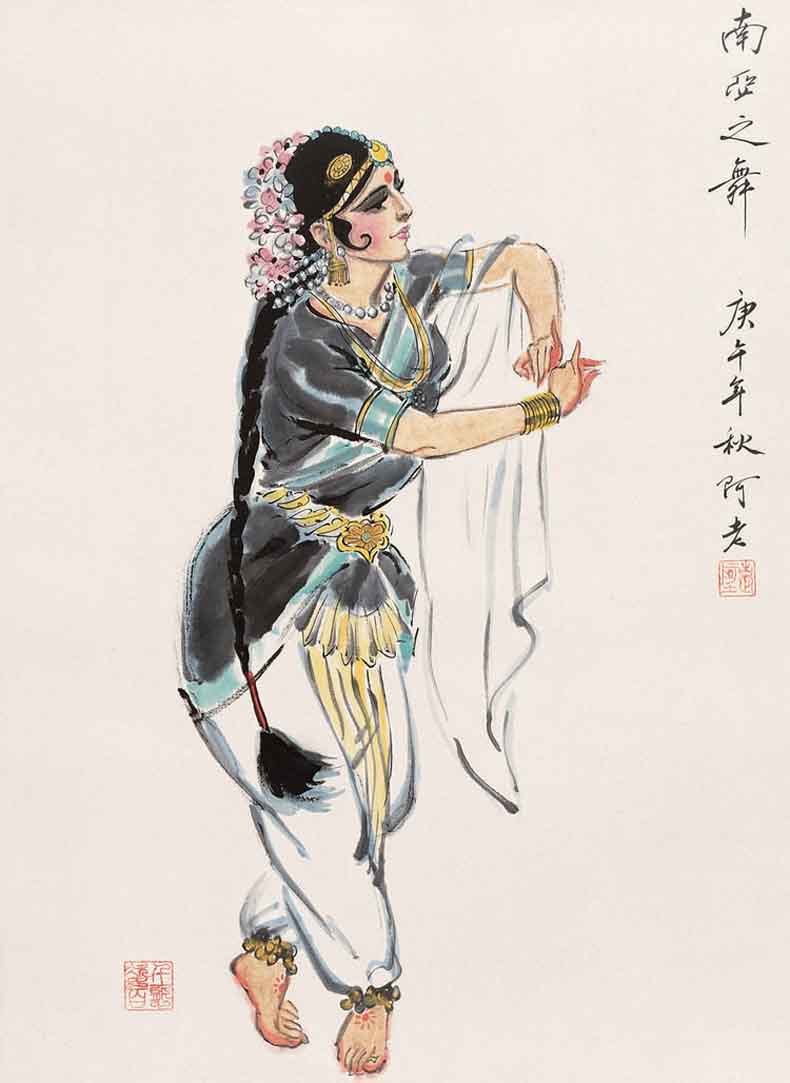 阿老(1920-),原名老宪洪。广东顺德人。当代著名画家,尤以舞蹈人物速写名世。其舞蹈人物画造型准确、洗练,线条娴熟流畅,善以音乐韵律感融入彩墨中,表现了不同的民族个性与庄重典雅柔美的气质。历任北京艺术学院、北京艺术师范学院副教授,中央工艺美术学院副教授、教授、副院长。