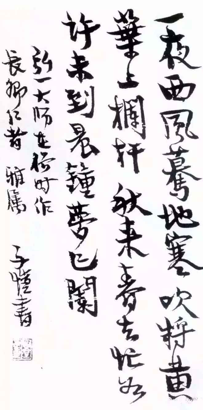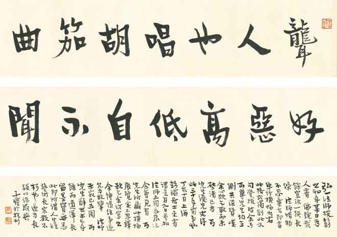 丰子恺曾说:“书法是最高艺术……艺术的主要原则之一,是用感觉领受。感觉中最纯正的无过于眼与耳。诉于眼的艺术中,最纯正的无过于书法,诉于耳的艺术中,最纯正的无过于音乐。故书法与音乐,在一切艺术中占有最高的地位。”其书法宏大气度,蕴含于毫芒之间,其烂漫气质又流露在造型结字之内。