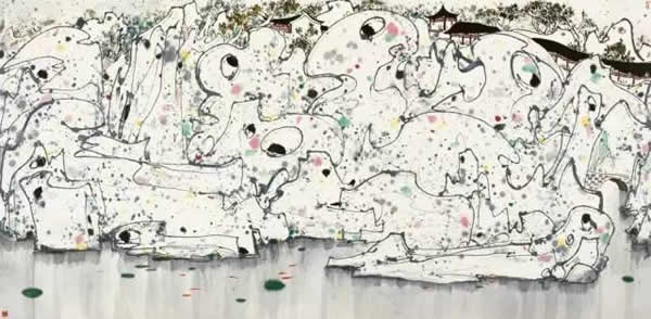 《爱痕湖》为张大千1968年所作巨幅绢本泼彩,描绘的是远眺瑞士亚琛湖所见。这是张大千化用西方抽象派艺术与中国传统文人艺术的水乳交融之作,也是以现代的语言对北宋以来山水画的现代性“翻译”,不仅是张大千的艺术臻于化境的象征,也是中国传统艺术最成功的“现代性突围”。