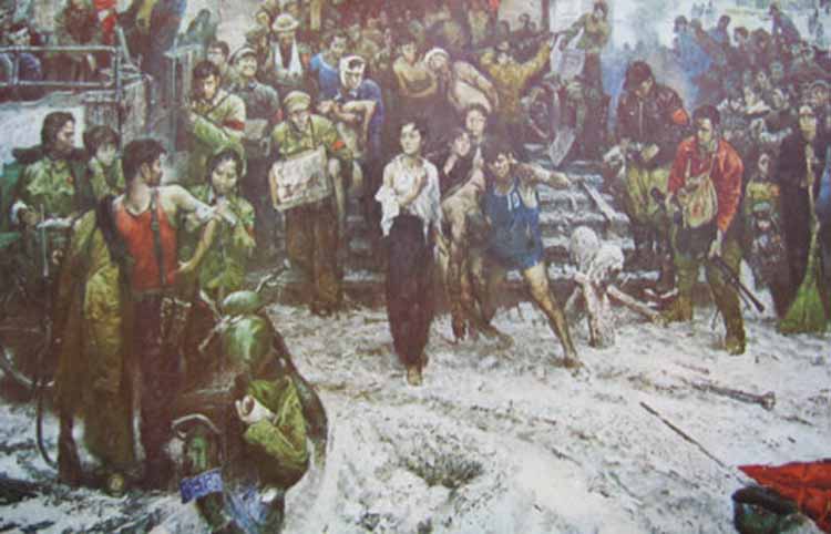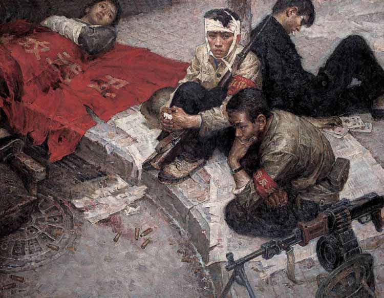 蔡景楷的《真理的道路》,实际上表现的就是76年的“天安门事件”。那个时候大家为了悼念总理写诗歌。当时有《天安门诗抄》,有些诗写得非常精彩,表达了人们对总理的一种思念,但是这个活动遭到了镇压。这个画就是这样子的,一个跟大家的年纪相仿的女孩,她一定要把这朵白花给献上去,她的头已经被打破了。拿着警棍,拿着镣铐的人这样的一些处理方法,表现了当时人们还是坚持真理,有所追求的。