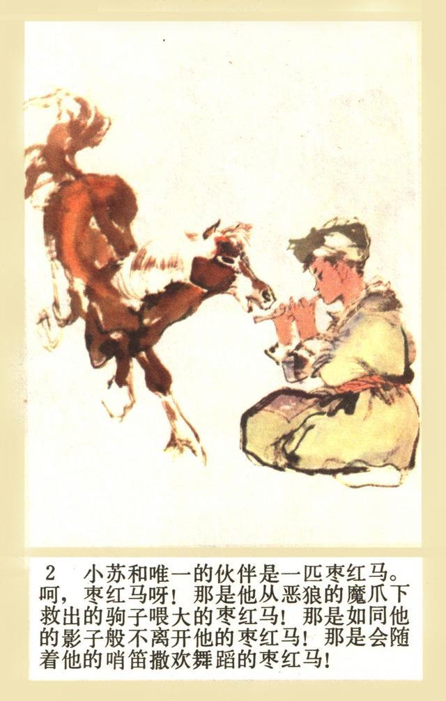 5.穷牧民们商议了又商议,要挑选出代表本旗百姓的旗手和快马,在赛场上争第一,不让王爷借口搜刮穷牧民。挑呀,选呀,一千匹马中挑上了枣红马,一千个人中选出了小苏和。小苏和两眼放光,说:『我一定要争得第一,为乡亲们夺回王爷抢去的牛羊!』