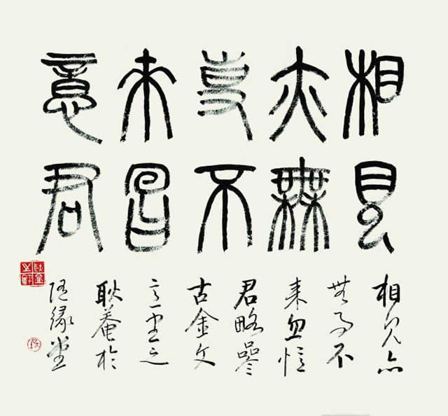言恭达,当代篆隶书之高手,他以中锋用笔使其线条厚实、凝重,偶用侧锋取妍、得飘逸之恣。