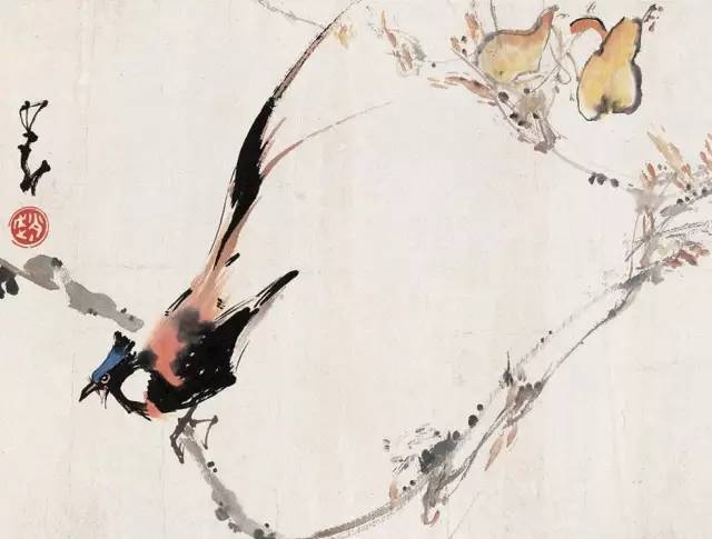潘天寿,精于写意花鸟和山水,偶作人物。其作品墨彩纵横交错,构图清新苍秀,气势磅礴,趣韵无穷。
