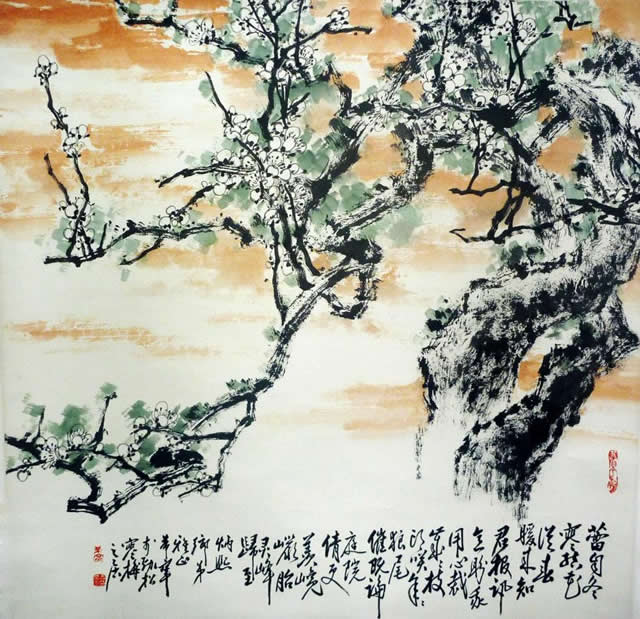 关山月,艺术上坚持岭南画派的革新主张,追求画面的时代感和生活气息。他的山水画立意高远,境界恢宏;他的梅花,枝干如铁,繁花似火,雄浑厚重,清丽秀逸。