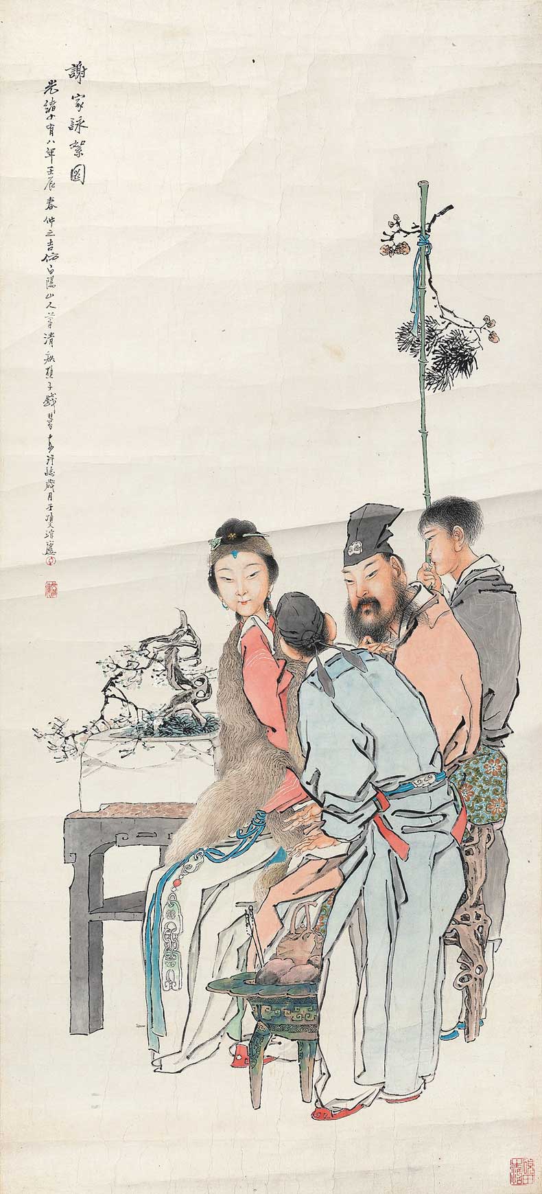 钱慧安(1833~1911),初名贵昌,字吉生,号清溪,宝山人。自幼学画,后居上海城隍庙卖画为生,为“城隍庙画派”代表画家。1909年豫园书画会成立,钱慧安被推为会长,一时从者甚众,出色者有沈心海、曹华、谢闲鸥等,后渐有“钱派”之名。工人物、仕女,细笔干墨,笔意遒劲,神态闲雅,其调介于老莲、十洲之间。花卉山水亦善。晚岁用笔益趋劲峭。钱慧安绘制人物,常以自画像入画,独具创意。程十发称其为“海派艺术宗师”。著有《清溪画谱》。