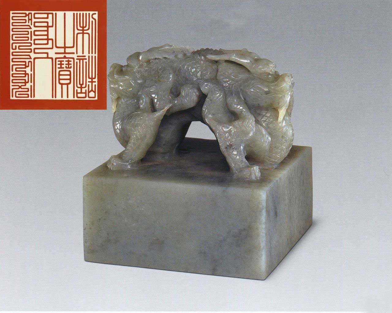 【天子之宝】, 白玉质 面7.8厘米见方,通高6.4厘米,纽高4.2厘米 祭祀百神之用。