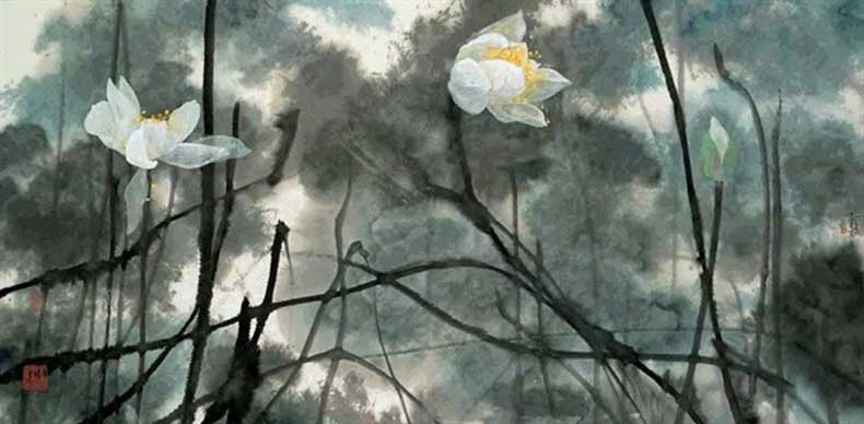 袁运甫的彩墨荷花作品,被尊称为“画荷国手”。荷花是他笔下最为常见的题材。泼墨泼彩间层层晕染的荷叶、粗野豪放的枝干加之细腻入微的盛放着的花朵使画面形成极大反差,极大的烘托出花朵与花蕾所带给欣赏者的愉悦感,给人以全新的视觉冲击力。浓淡相宜的墨色间烘托出画面的红、黄、蓝、绿、白极为醒目,不温不火、不矫揉造作,使得墨与色的交融恰到好处。他的创作灵感与激情不断生发,不断地创造出赏心悦目的佳作。荷花是一个常见的创作题材,选择画荷就意味着挑战。他的艺术世界里,美学思想是深沉静默地与着无限的自然。