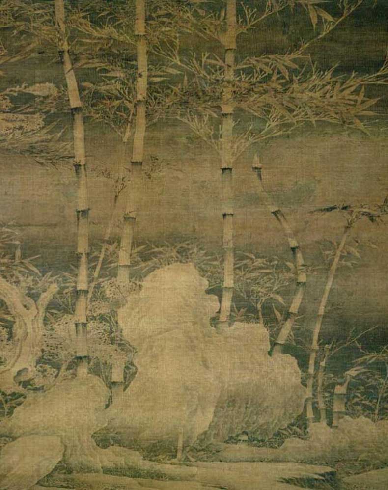 以《雪竹图》观之,图绘雪后的枯木竹石。下方是大小数方秀石,不重勾勒而用水墨晕染出结构,留白以示积雪。石后中间是三竿粗竹,挺拔茁壮,细枝遒劲,残叶纷披。旁有数竿被雪压弯或折断的竹子,或粗或细,或断或弯,又有数竿细竹穿插其间,显得姿态多变,情趣盎然。左旁则现一段枯树,枝杈被折,或勾叶,或晕染留白,映衬雪景的萧瑟。而在刻画上,勾皴与晕染,粗笔与细笔,浓墨与淡墨,墨染与留白,兼施并用,同样是谨严的写实作品,与北宋盛行的“细勾填彩”、务求逼真的画风相比较,显得率意而出格,然而却也更多变化,更富情趣。