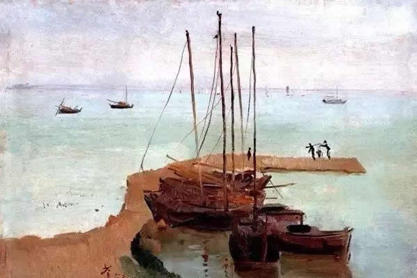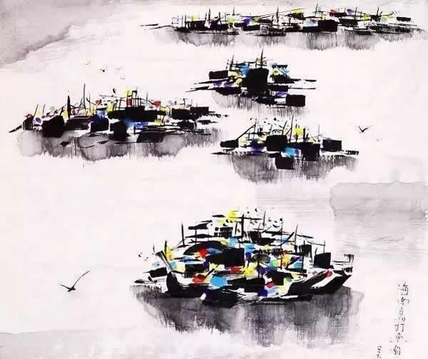 吴冠中爱画船,主要由于视觉美的吸引。孤舟、舟群、帆起帆落、绳索交错、桅杆倒卧起伏、线缠绕着面、手忙脚乱的渔民。色彩的斑驳,都给予画家尽情挥写的大好时机。