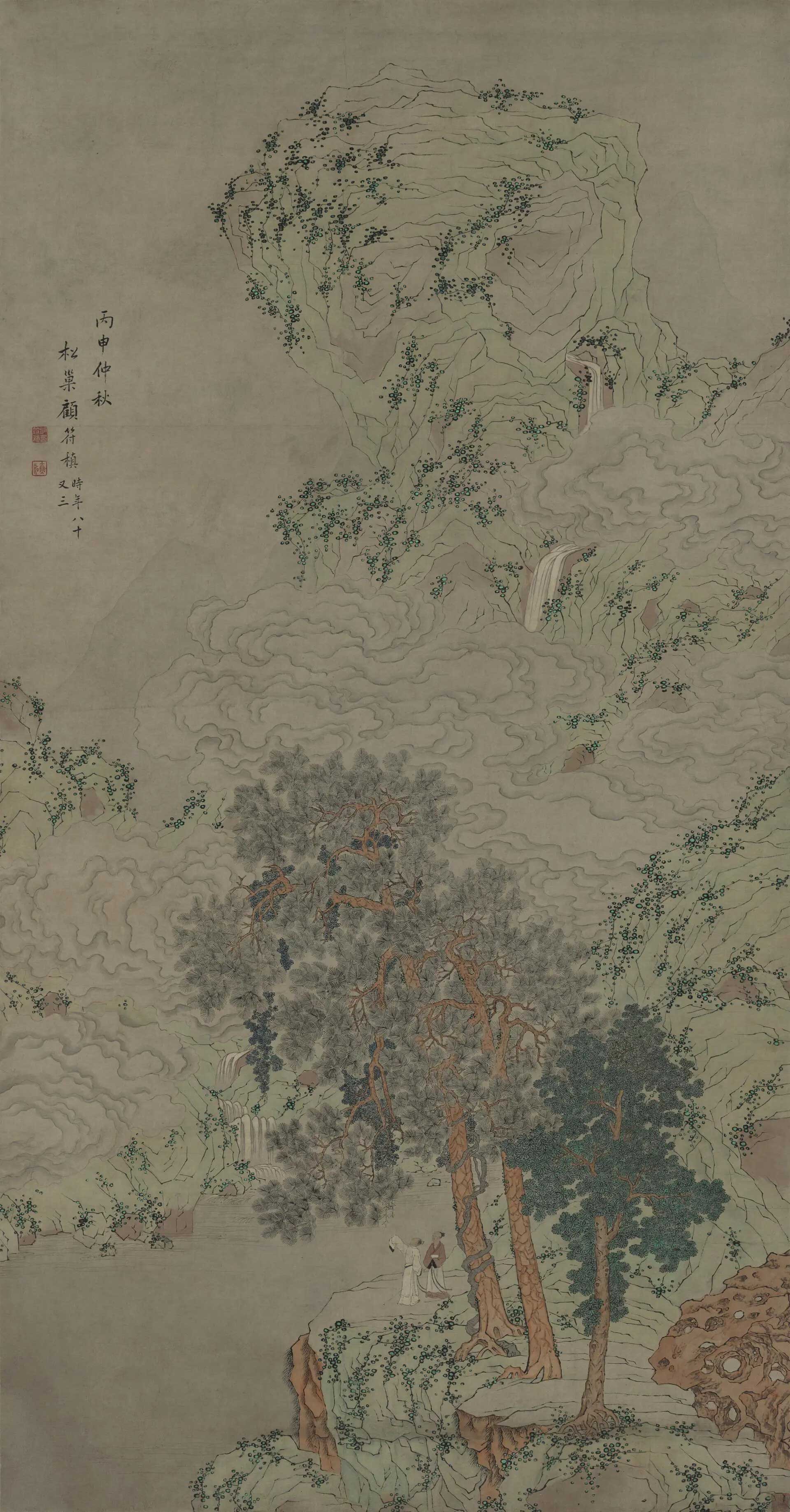 顾符稹(1634-1715),又名顾符稹,清代著名山水画家。他尤其以山水描绘而闻名,其笔触豪放、笔墨表现力强、构图动态。顾甫臣的作品因其捕捉自然雄伟的精髓、唤起宁静和谐的感觉而受到高度评价。顾符稹的《松下观瀑布图》笔法特点是豪放、表现力强,常常用粗犷的笔触来表现山峦的雄伟和河流的雄浑。