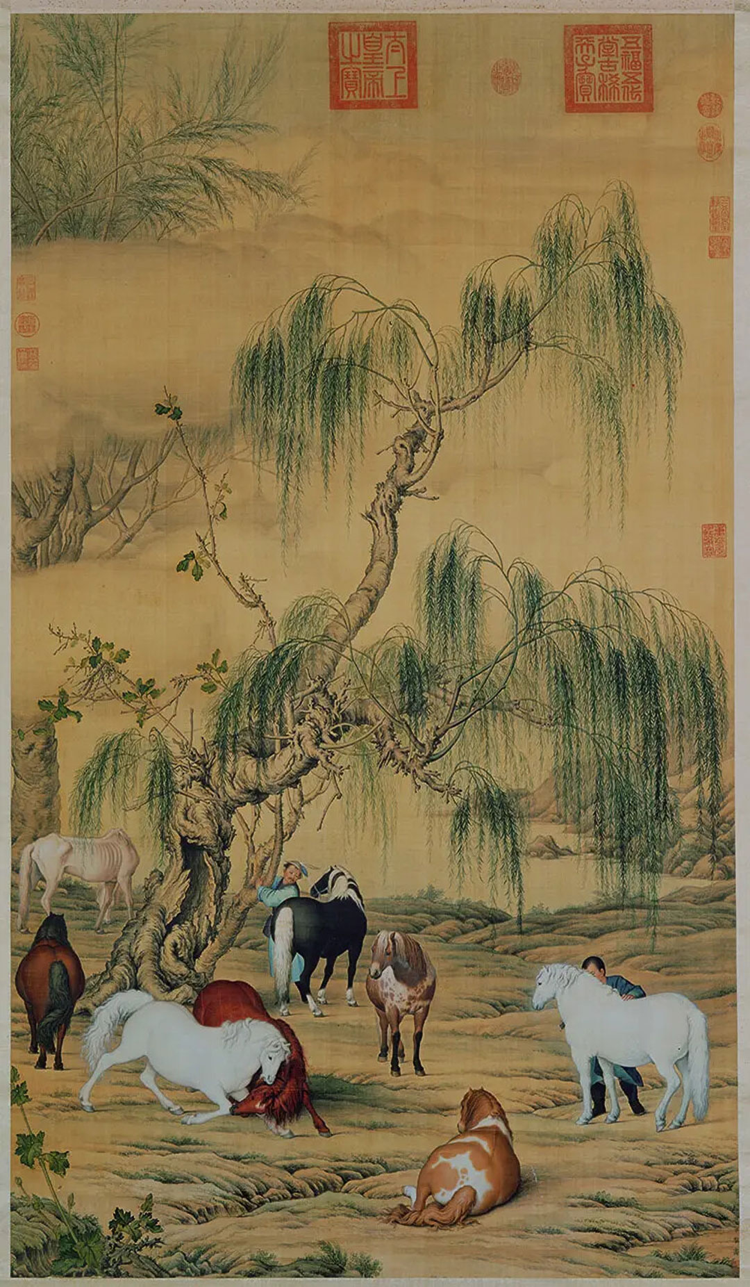 本幅虽然是采用中国传统的颜料来作画,但在马匹、人物和柳树的表现上,却融入了西画注重光影的手法,显得立体感十足。右下角的签名,用极工整的仿宋体书写据推测,此画应是郎世宁来华初期雍正年间所绘。上有款识:臣郎世宁恭画。钤印二。臣世宁。恭画。现收藏于台北故宫博物院。