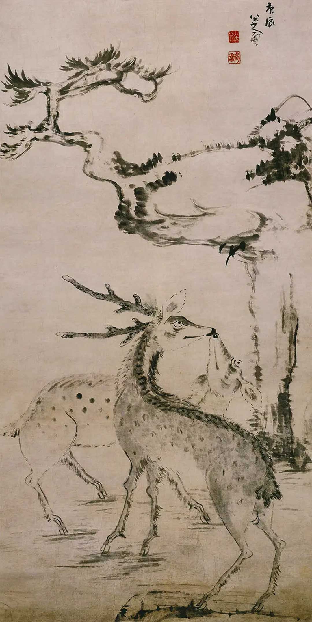 《松树双鹿图》为明末清初画家朱耷所绘,其在绘画上以大笔水墨写意画著称,并善于泼墨,尤以花鸟画称美于世,所绘此松树双鹿图轴现收藏于中国国家博物馆。