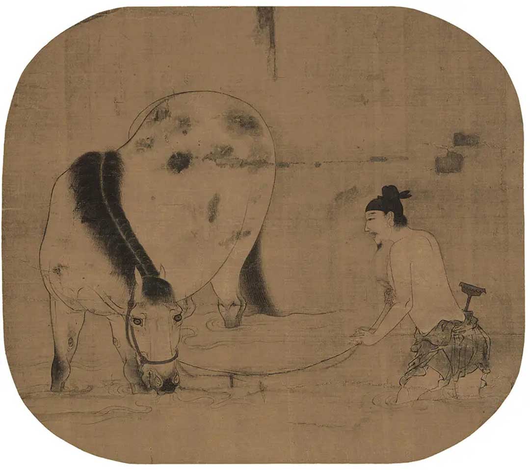 韩干(706~783),唐代画家,长安蓝田(今属陕西)人,官至太府寺丞。善画肖像、人物道释、花竹,尤工鞍马。韩干初师曹霸,为其入室弟子,后自成一家。所绘马匹,体形肥硕,态度安详,比例准确,一改前人画马螭颈龙体、筋骨毕露、姿态飞腾的“龙马”作风,创造了富有盛唐时代气息的画马新风格。杜甫在《丹青引》中有“干唯画肉不画骨”的诗句,在《画马赞》中又说:“韩干画马,毫端有神。……鱼目瘦脑,龙文长身,雪垂白肉,风蹙蓝筋”。对他的画马,赞赏备至,后人将他与当时最善画牛的戴嵩并称为“韩马戴牛”以画马着称。