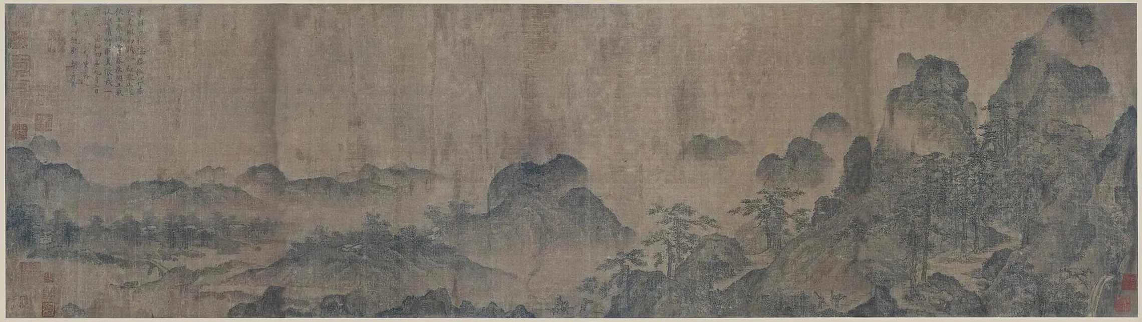 北宋大参郝玄明出使秦之际,胡舜臣作画并题送别诗。画面中央偏下方,可见郝氏与侍者骑着驴马行走在山道上。元夏文彦《图绘宝鉴》记载,胡舜臣为郭熙弟子,继承了“熙之一偏”,画风“紧密”。此图是其传世孤本。胡氏生活在两宋更替之际,在继承北宋整体性山水构图的同时,又自创以山的棱线为对角线的构图方法,开创了南宋构图的先例。