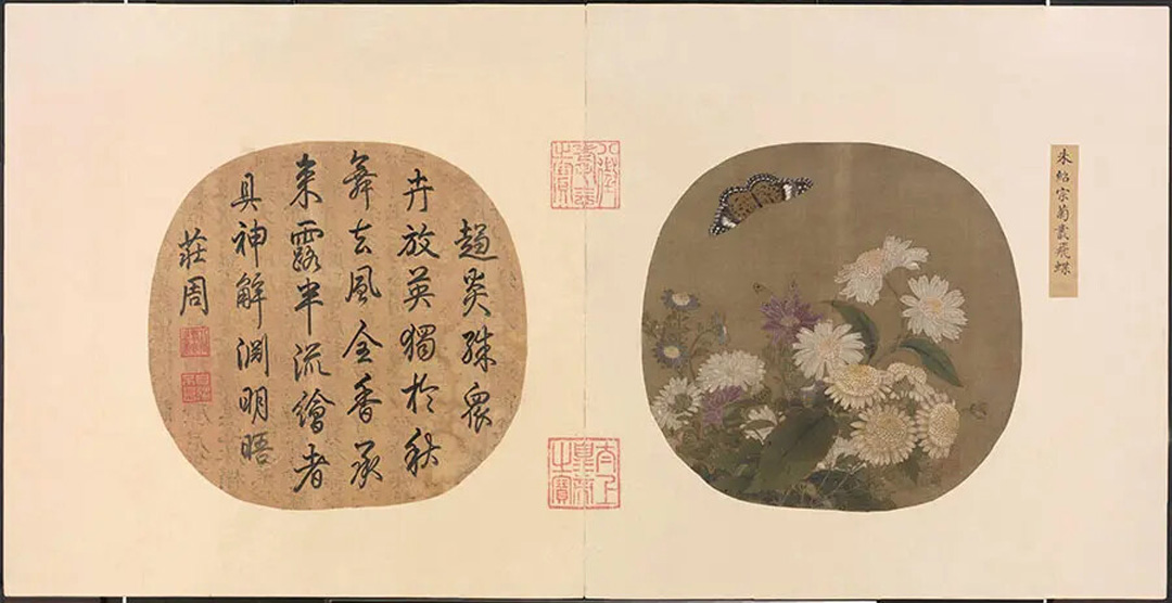 对幅有清乾隆御题诗:“趋炎殊众卉,放英独于秋。舞去风全香,承来露半流。绘者具神解,渊明晤庄周。”钤“八征耄念之宝”朱文印、“自强不息”白文印。此图原载《四朝选藻册》,见《石渠宝笈续编》。签题朱绍宗作。画幅上题一“朱”字,其下已无字迹。今从《四朝选藻册》,作朱绍宗作。