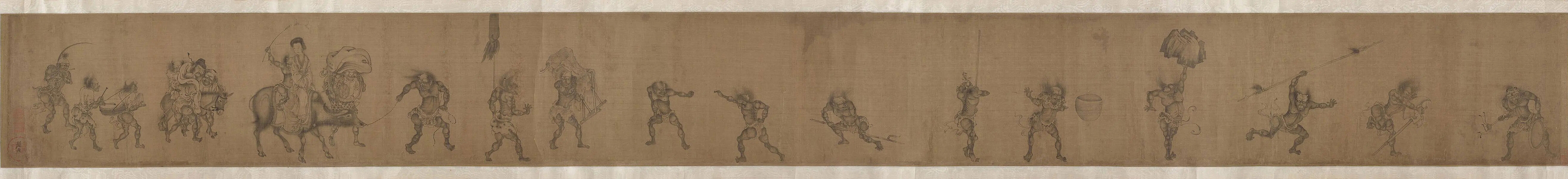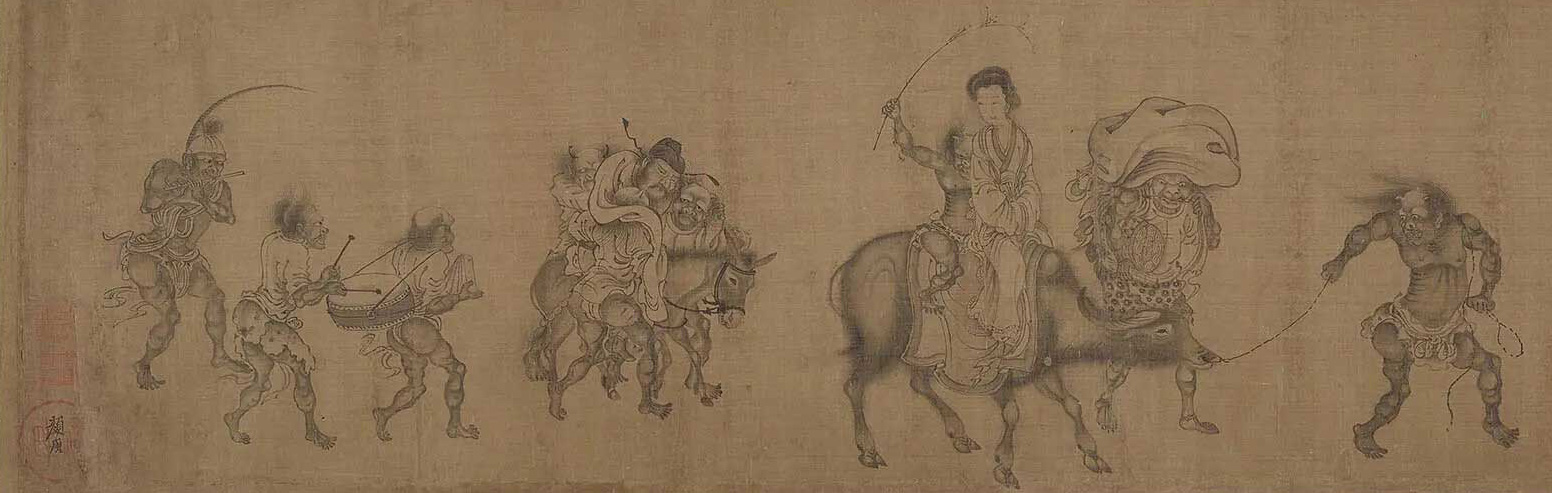 画面前段绘九个小鬼手持锣、斧钺、钢叉等物,正嬉笑玩耍;中段绘三个鬼怪提扛重物;后段绘一鬼牵牛,钟小妹侧坐于牛背上,含笑看着后面酒醉、被众鬼搀扶骑于驴上的钟馗,钟小妹身后一鬼正在赶牛。队伍的末端有三鬼,正敲鼓吹笛。除提扛重物、服侍钟馗的鬼奴之外,其余的鬼怪应为钟小妹出嫁时的乐舞队或戏班之属。而画面最末的吹笛鬼怪,头上插有一支雉尾,相当醒目,可以作为判断此画年代的依据之一。