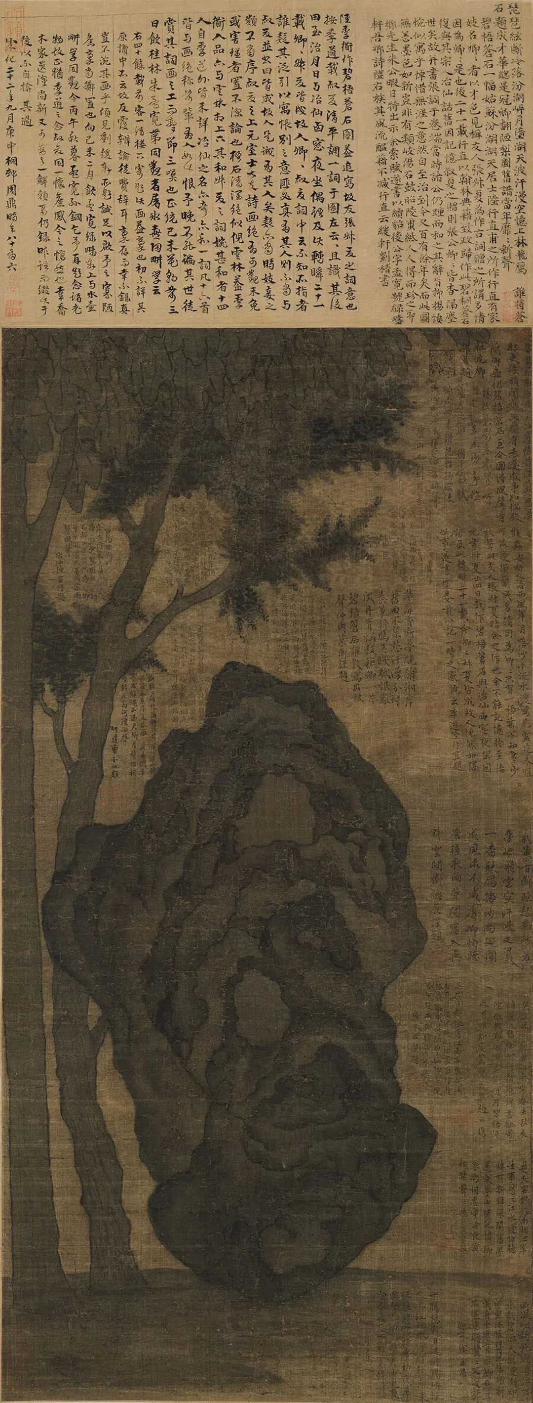 图绘一块巨石立于画中,两株高大的梧桐、柏树冲天而立。湖石用繁皴密染,树叶勾点兼用,笔墨清劲,构图平中求险,为陆行直传世名作。本幅右方自题词一首并记一段,末书款“季道陆行直题”。钤“致和斋”、“陆季道氏”二印。本幅右下又题词一首,末款“陆行直重题”。本幅有元人刘则海、叶衡、冶仙、曹仲达、卫德辰等14家题记,诗堂有明人刘稽、周鼎题识,裱边有谢希曾跋。经明项元汴收藏,后归李一氓。