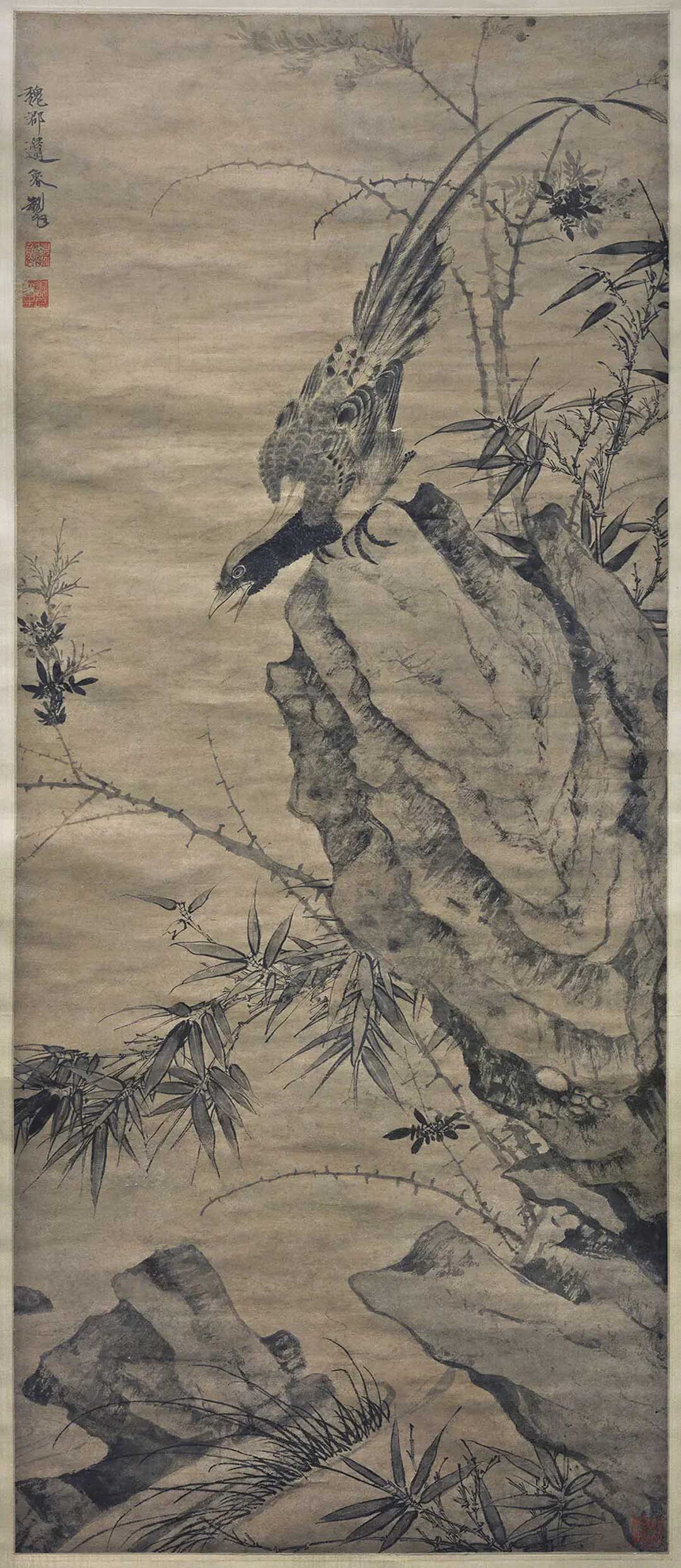 此图画面构图严谨平稳,奇石的倾斜方向和雉鸡体态的走向形成十字交叉,使二者在倾斜中达成平衡,在平衡中体现生动。倾身翘尾鸣叫,似乎跃然而出的雉鸡,和静止的奇石,对比呼应,动静相趣。笔法上,该图工写结合,皴染勾勒相得益彰。雉鸡造型准确,刻画精细,姿态生动,形神兼备。画家仅以墨色的浓淡深浅变化和适度留白,即将雉鸡五彩斑斓的羽毛表现的淋漓至尽。石头的勾勒,翻转流畅,尽显其圆浑坚硬的质感。双勾竹子工整古雅,兰草劲健,杂而不乱,用笔爽利飘逸。整个画面朴素而充满生机。