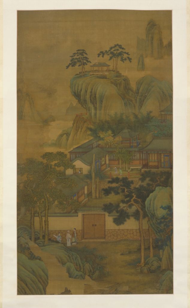 《山水楼阁图》轴,清,沈源绘,绢本,设色,纵135厘米,横74.8厘米。本幅题:“臣沈源恭画”,钤“臣沈源”印。