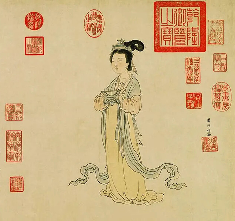 此图绘唐代杜秋娘,图中杜秋娘手持排萧婷立,作唐妆打扮。人物面相丰润,身材适中。本幅款识:至元二年岁丙子正月廿四日,冰壶为余书杜秋娘,遂书杜牧之之诗于其后。二月十七日山识。署款:“周朗伯高。”下钤印“冰壶画隐”。本幅有元代书法家康里巎巎行书录唐杜牧《杜秋娘诗》,明宋璲题记二段。钤清乾隆、嘉庆、宣统内府收藏印等,共计23方。
