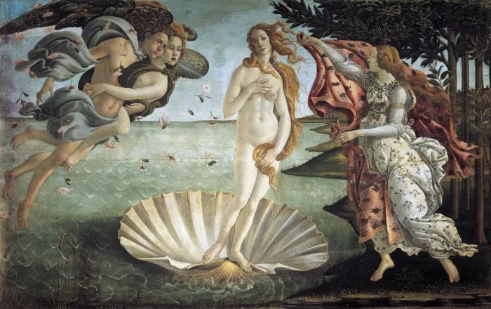 从海洋的泡沫中刚诞生出来的美神维纳斯站立在一只蚌壳上,两位风神轻轻地把她吹送到岸边。右岸上的时辰女神手拿美丽的花斗篷迎接美神的到来,天空下着玫瑰花雨,海面微微起着波浪……