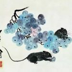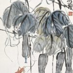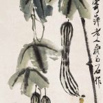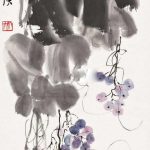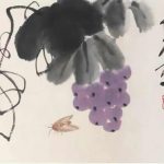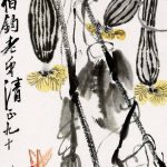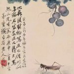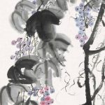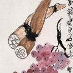 白石老人常画葡萄,葡萄籽多,因而寓意“多子多福”。藤条、墨叶之间,晶莹剔透,犹如一串串紫色的明珠,呈现出旺盛的生机,也营造了画面明朗乐观的基调。 在齐白石众多的绘画题材中蔬果类作品是最能触及老人思乡情结的一类,他将这些日常所见之物,寄予了深层精神内涵,超越了绘画的内容和形式。齐白...