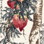 齐白石画桃,先以没骨大写意法直接用洋红泼写硕大桃实,渗以少许柠檬黄,再以花青、赭墨写出叶子和枝干,后用浓墨勾勒叶筋,设色浓重艳丽。与其画荷花所创的红花墨叶恰成强烈对照。 top1、吉寿永昌丨243×61.5cm丨4140.00万 top2、鹤寿图丨155×39cm丨2072.00...