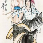 下面为本站藏品,黄胄《赶驴图》,4尺。是幅《赶驴图》创作于1987年,与70年代相比,这件作品多了几分豪放和潇洒的成分,笔墨上更加自由奔放;而其构图和表现上,则更加丰富多彩。这当然源于他长期写生的结果。《赶驴图》即是表现西北新疆风情的绘画,从风格上看,是属于黄胄晚期作品中的精品。...