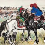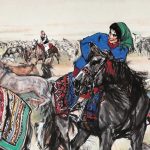 此幅《欢腾的草原》绘制于1981年,表现的是新疆柯尔克孜族人民正在进行传统体育项目一一“马上较力”的活动场面。画面中,众多人物与动物一一七位女性、九条牧羊犬以及八十多匹骏马一一通过艺术家的精心布局与传神刻画,和谐而又充满内在张力地再现于巨幅画纸之上,组成了一幅洋溢着乐观主义精神,...