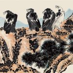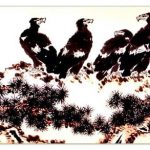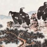 《李苦禅松鹰图》是现代画家李苦禅创作的一幅花鸟画。这幅画创作于1973年,画面上五只威猛的大鹰栖息在高耸的崖石之上,周围挺立的苍松郁郁葱葱。从共性上看,苍鹰的喙如同五柄利斧,用淡淡的花青晕染之后似乎闪现着冷冷寒光。鹰的利爪宛如钢钩紧扣崖石。五只雄鹰浑身浓黑,如同钢铁铸造成的雕像,...