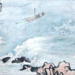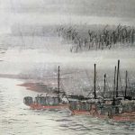 陆俨少先生画峡江山水是前无古人的,在他创作的《千里江陵》画中,其所画之水,离合聚散,屈曲流转,水势迅猛,喷薄回旋而下,极显生气,其漩涡画法,波势湍急,转如车轮,馀波四射,惊湍跳沫,一泻千里,极尽三峡奇险之状。陆俨少的用笔以“柔”称,这在《千里江陵》的画水中大有体现。 △陆俨少《千...